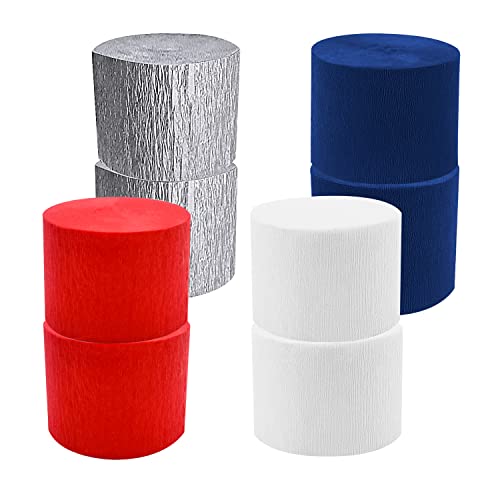 Patriotic Party Streamers: 8 rolls of crepe paper streamer decorations, colors include silver, red, white and navy blue (2 of each color), ideal for decorating patriotic themed party, adding holiday atmosphere for your party.
