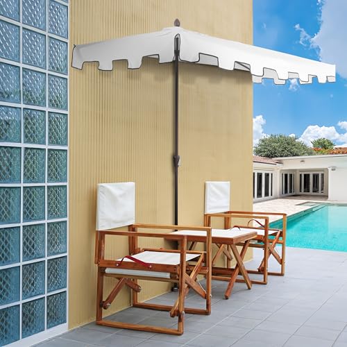 Click for More Images HALF UMBRELLA: Traditional design features solid white canvas with a square-scalloped bottom edge and black piping; dark brown aluminum poleConvenient manual crank mechanism is easy to operateTraditional design covers two...