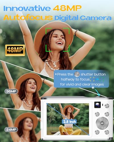 Click for More Images 48MP UHD 4K Digital Camera with Autofocus: The Digital camera features the latest CMOS sensor system with Autofocus. Press the shutter button halfway to focus for vivid and sharp images. The digital cameras for photography...