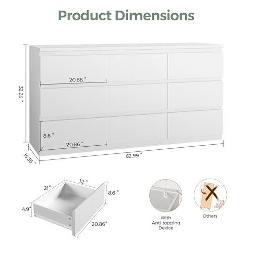 Click for More Images AMPLE STORAGE WITH 9 DRAWERS: This 9 drawer dresser for bedroom provides generous storage space for clothes, linens, and accessories. Perfect as a white dresser for the girls' bedroom or any other room in the homeSTYLISH...