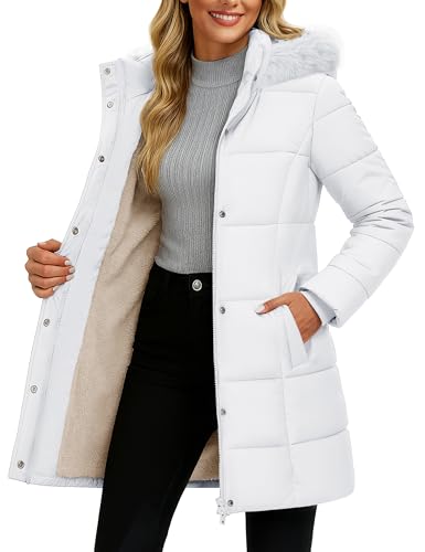 Click for More Images Material: Waterproof parka for women, shearling fleece lined, zip-and-button closure, knee length, warm and thicken, womens winter coat has a water-resistant shell and full sherpa lined, which is soft, warm and comfy to...
