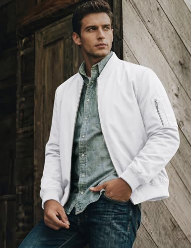Click for More Images Material: Polyester; Lightweight, Windbreaker, BreathableFull zipper stand collar bomber jacket, The zipper head is on the leftFEATURE: Rib Knit Cuffs, Waistband, Collar for comfort, Dual pen pockets on sleeveMULTI-POCKETS:...