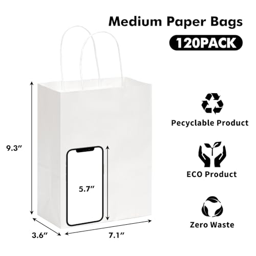 Click for More Images CONSTRUCTION – These bags are made from FSC Certified recyclable 120 GSM white kraft paper capable of holding a weight of 9 LBS. Each bag measures 10" wide by 5" deep by 13" tall. Our medium sized gift bags are made to be...