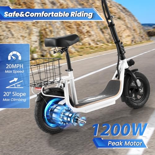 Click for More Images ?Powerful Motor & High-Capacity Battery? The Caroma Electric Scooter features an 1200W peak motor, capable of climbing 20° inclines and reaching a top speed of 20MPH. Its 48V battery charges in just 7 hours and delivers an...