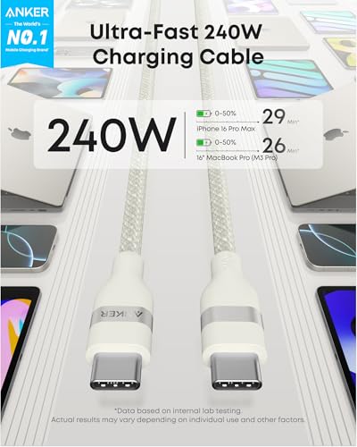 Click for More Images Super-Fast 240W Cable: This 240W USB-IF certified cable can charge your 16-inch MacBook Pro (M3 Pro) to 50% in just 26 minutes or your iPhone 16 Pro Max to 50% in 29 minutes. (Note: This cable does not support screen...
