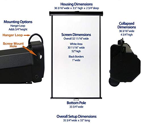 White screen area: 30-11/16″ W x 52″ H Overall dimensions (fully extended): 36-3/16″ W x 55″ H