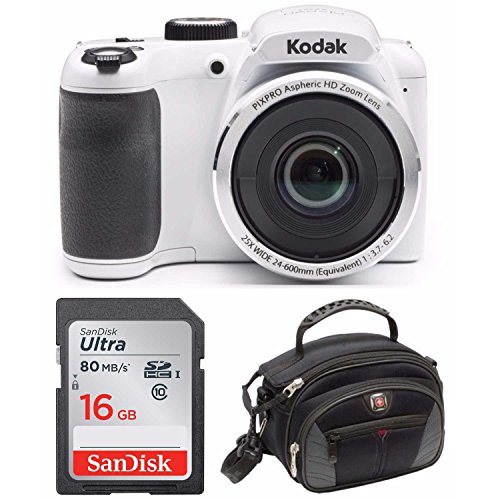 Kodak PIXPRO AZ252 Point & Shoot Digital Camera with 3” LCD (White) with 16GB Card and SwissGear SHERPA Large Camera Case