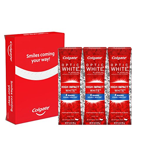 Colgate Optic White Platinum High Impact White whitening toothpaste starts working in just 3 days to make your teeth 4 shades visibly whiter (when brushing teeth twice daily for six weeks). Colgate Optic White Platinum High impact white contains...