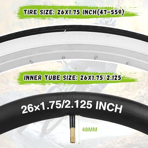 Click for More Images Tire Size: 26 x 2.125 inch; ETRTO: 57-559 mm. Fits tire widths: 1.75-2.125 inch.Tire PSI ranges from 40-65 P.S.I; TPI: 30.Bike Inner Tubes Size: 26" x1. 75" - 2. 125", Valve length/type: 32mm /Schrader valve.With 2 tire...