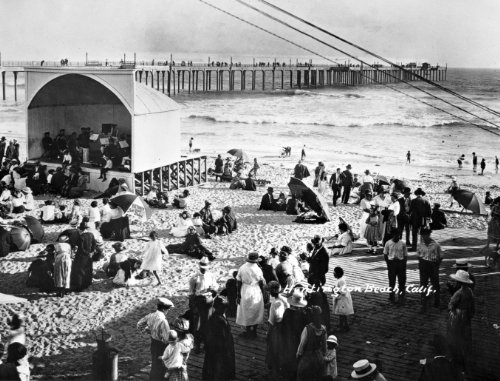 This photograph shows a fun day at Huntington Beach, California. Pictured, are swimmers and a group listening to a band perform. Photograph is inscribed: "Huntington Beach." ca 1908. Printed on premium semi-matte paperArchival rating of 125+...