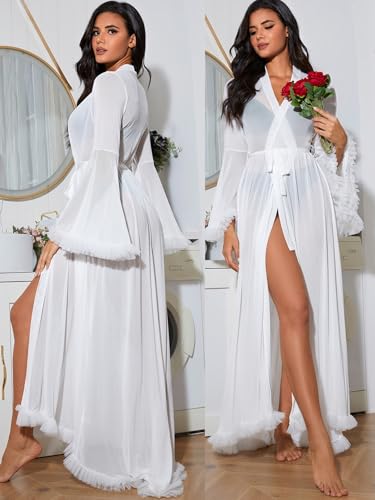 Click for More Images Fabric: Lightweight, comfortable and stretchy to wearDesign: Long trumpet sleeve, belted, ruffle frill trim, see through, long length, solid color, elegant styleOccasion: Excellent for wedding night, photograph, nightwear,...