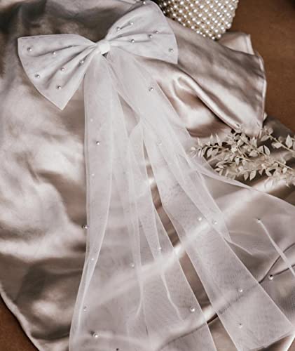 Click for More Images Bridal hair bow made from exquisite white tulle,finely scattered in delicate pearls to create the perfect hen-do, honeymoon even wedding day hair of dreams.Bow pearl veil has 23cm/9.1inch wide and 50cm/19.7inch long.Pearls...