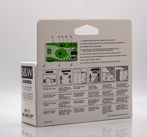 Click for More Images Single-Use / Disposable CameraLoaded with Ilford HP5 Plus B&W Film27 ExposuresBuilt-in flash for low-light situationsFixed focus lens with a focal length of approximately 30mmSimple point-and-shoot operation, no settings or...