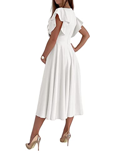Click for More Images This sexy deep v neck a-line midi dress with flutter ruffle sleeve, highlights chest area, made of soft material,comfortable to wear.The warp front v neckline short sleeve dress features with ruffle trim sleeve, warp v-neck,...