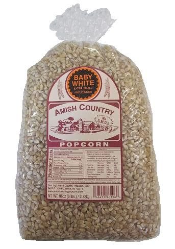 Baby White popcorn is our smallest and most tender popcorn variety. Comes in 6 pounds of delicious, gourmet baby white popcorn from Amish Country Popcorn. Our variety has a smaller kernel that generally has a more tender hull. When it pops, the...