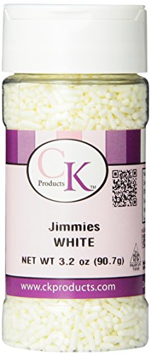 This is a 3.2 oz. bottle of red jimmies. Use jimmies to decorate your cakes, cupcakes, cookies, other baked goods and ice cream. This item is made in the USA and Certified Kosher. 2 year shelf life if kept in a cool dry areaMade in the...