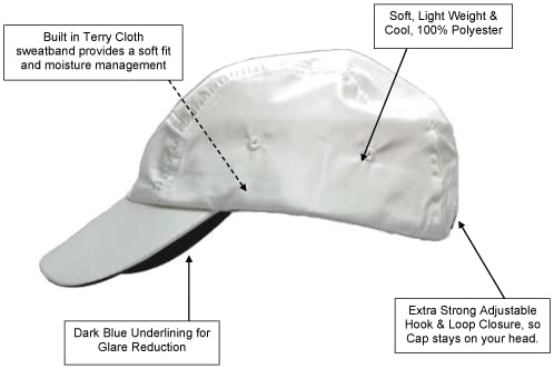 Click for More Images Dark Blue trim under Bill of Cap for Glare Reduction.Extra Strong, Adjustable Hook n Loop Closure. Keeps Hat on your head!Made with a built in terry cloth sweatband liner to help keep sweat out of your eyes.Main part of cap...