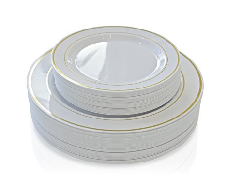 . 50pc pack Includes: 25 x 10.5'' Dinner Plate + 25 x 7.5'' Appetizer/Dessert platesMade out of high gloss premium rigid disposable plastic.Single Use - Recyclable and BPA freeColor: White with Gold...