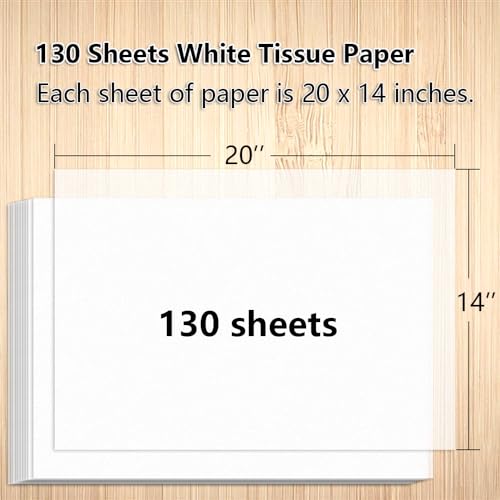 Click for More Images Each tissue paper is 14" x 20", providing ample coverage for various gift wrapping and DIY many objects.130 sheets of white tissue paper. Enough to meet your gift packaging needs for daily festivals and birthdays.Premium...