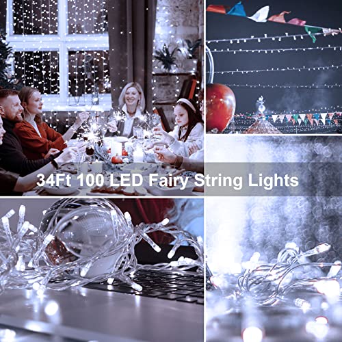 Click for More Images Total length: 34 ft (Battery pack to first light: 1 ft., Distance between lights: 4"),Strand of 100 cool white LEDRemote control Auto timer(6 hours on, 18 hours off) and 8 Modes light sequencesDimmable: Press DIM- or press...
