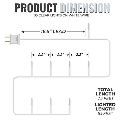 Click for More Images 35 Clear Lights on a white cord, UL Approved for indoor use only6.1 Foot of Lighted Length, 7.5 Foot of Total Length, 2.2 Inch Spacing Between Bulbs1.5 Foot lead from plug to first light. Only one end with plug (male/female...
