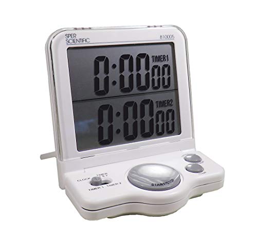 Click for More Images Sper Scientific 810005 White Large Display Timer Features the largest display available on a timer: 3 x 2-1/2". Simultaneously displays either one count up channel and a clock, or two count down channels. Count Up Channel:...