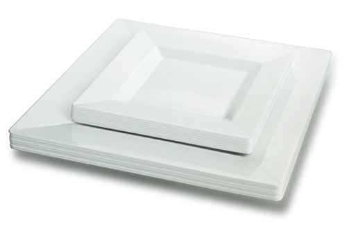 . 50 pack Includes 25 x 9.5 '' Square Dinner Plates + 25 x 6.5'' Square Cake / Dessert platesMade out of high gloss premium rigid disposable plastic.Color: Plain WhiteSingle Use - Recyclable and BPA...