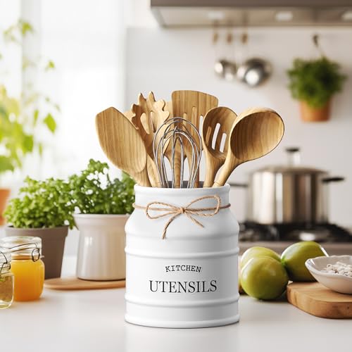 Click for More Images Ceramic Utensil Holder - Decorate, organize, and beautifully display your cooking utensils in this farmhouse kitchen utensil holder. A decorative kitchen utensil holder for your countertop that will keep your kitchen neat...