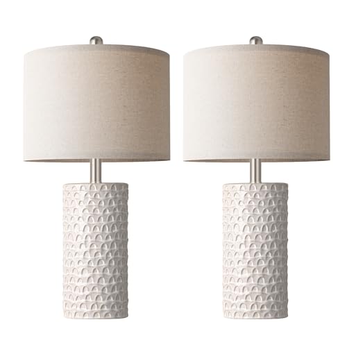Click for More Images ?Unique Antique White Design? Our farmhouse table lamps for living room are designed with resin bases which handy brushed by craft men, each strips are boasted a retro white color. Paired with a cream linen lampshade, this...
