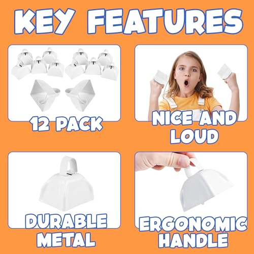 Click for More Images PACK OF 12 - 3 INCH METAL WHITE COW BELLS WITH HANDLE: Get ready to make some noise with this bulk pack of 12 cow bells. Each set includes a total of 12, White 3 Inch Metal cow bells with top handles. These cowbells for...