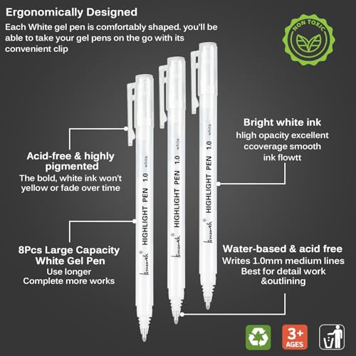 Click for More Images FINE POINT WHITE GEL PENS: 1.0mm White Gel Pens pens to add shines, glares, snow, highlights and more to your compositions, Create Boldly on Any Colour of Paper - The white ink dries quickly and opaque so your designs,...