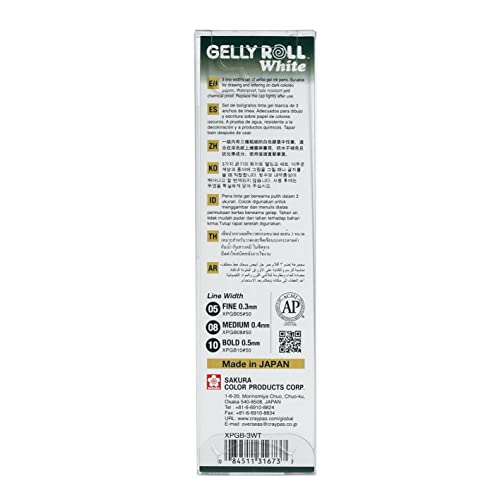 Click for More Images Gelly Roll Fine, Medium and Bold No. 05, 08 and 10. Set of 3 with brilliant white tone.3 pieces Gelly Roll "real white", "bright white" gel roller.Gel technique with water-based pigments.Pigmented gel ink with consistent ink...