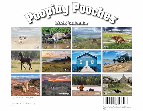 Click for More Images 2025 will not stink with 12 months of Pooping Pooches$1 from each sale is donated to help a dog in need17 x 11 inches when openUS HolidaysReal dogs answering nature's call More Information...