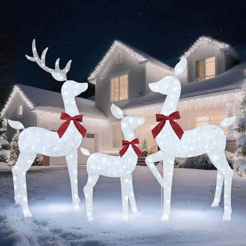 Click for More Images Lighted Christmas Outdoor Decorations - 4-foot tall 3-piece 2D White Reindeer Family Set with 145 warm white LED lights. Includes buck, doe, and fawn for outdoor Christmas yard decorations, perfect for lawns, gardens,...