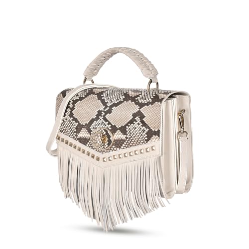 Click for More Images LUXURIOUS DESIGN: Crafted from genuine python and bovine leather featuring an elegant snakeskin pattern, decorative studs, and stylish white fringe detailVERSATILE CARRY OPTIONS: Includes both a top handle and an...