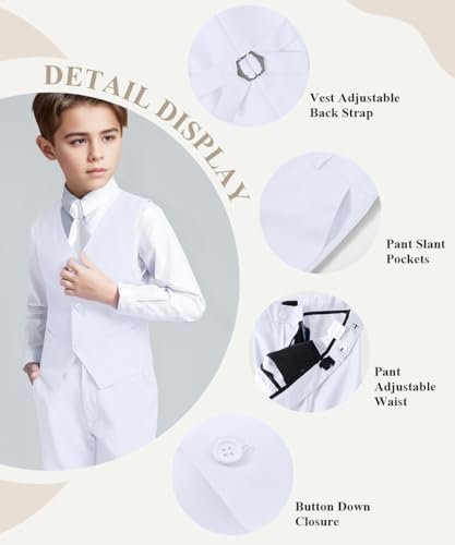 Click for More Images Shirt - Material: 65% polyester, 35% cotton, Color: WhiteTie - Pre tied and Adjustable,Fully lined and easy to wear,Color coordinatedVest - Full Lining and Back with adjustable strap, Pockets:2 front, Buttons:3 frontPants -...