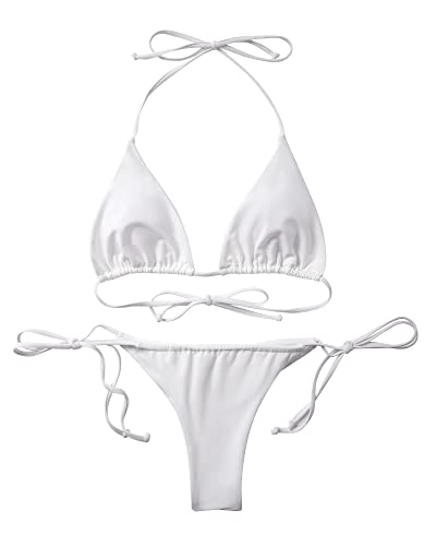 Click for More Images Material: 82%Polyester + 18%Elastane, ribbed tie side design.Top:String halter bikini top,tie closure on the back,sexy triangle bikini swimsuits,removable padded cups,ribbed bikini for women.Bottom:Side tie bikini...