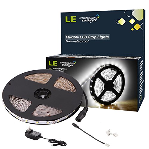 B00MHLIFO8High Brightness LEDsThis 16.4ft strip light includes 300 bright LEDs, and there are about 18 LEDs every foot.DIYCan be cut and being connectable, you can create your own DIY product with this soft light strip.With the provided connecting...