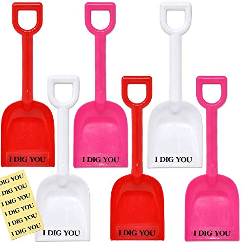 Gift Boutique plastic shovel set includes 24 mini shovels in 3 bright Valentine colors, 8 of each: Pink, Red & White. These plastic shovels with the "I dig you" stickers are perfect for kids classes for valentines day. Perfect for boys and girls....