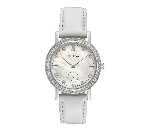 You'll love the slim dress styling of this Swarovski crystal accented leather strap and Mother of Pearl Dial watch from Bulova with crystals on the bezel. Case size: 32mmCase thickness: 7mmWater resistant to 30 metersLeather strap and silvertone...