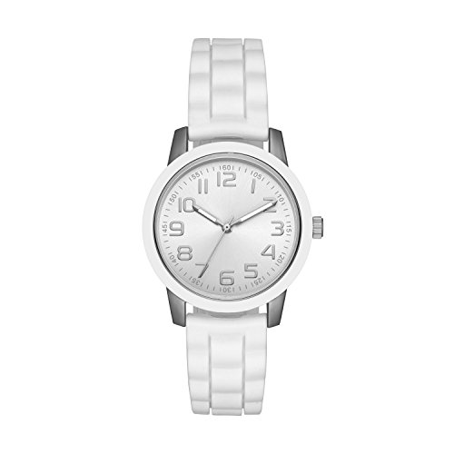 This 38mm watch features a white sunray dial with silver-tone numerals and white band. INCREDIBLE VALUE! This watch features a 38mm case, silver-tone plating, white rubber strap and a quartz analog three-hand movement.EASY READ DESIGN:...