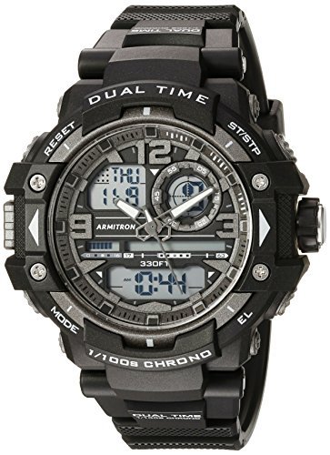Multifunction sport watch featuring chronograph, lap time, pacers, five alarms, dual time, military time, 100 year calendar, countdown timer, hourly chime and backlight with three second delay50 mm resin case with acrylic dial windowQuartze...