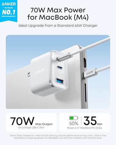 Click for More Images Power Your MacBook at True 70W Speed: Each USB-C port delivers 70W max of power—enough to charge a 14-inch MacBook Pro (2024) from 0 to 50% in 35 minutes. Compared to a standard 65W charger, it offers faster performance...