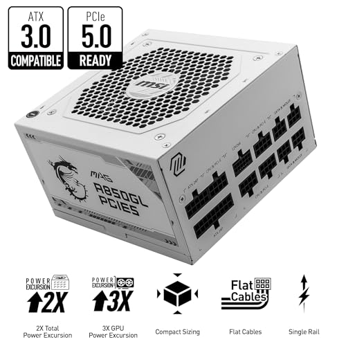 MSI MAG 850GL PCIE 5 White Gaming Power Supply – Full Modular – 80 Plus Gold Certified 850W – Compact Size – ATX PSU – 10 Year Warranty