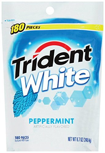 Whiten teeth and get close-up confidence with Trident White Sugar Free gum, the easy way to freshen breath and help protect against tooth decay. Chewing two pieces of Trident White Sugar Free Gum after eating and drinking helps whiten teeth in as little as four weeks. With 30% fewer calories than sugared gum, Trident White has long lasting flavor, fights plaque, and restores your mouth’s pH balance to maintain a healthy smile. Pop a piece of mouthwatering Peppermint Trident White for a refreshing taste that keeps going as long as you do. This order includes one 180-stick pack of Peppermint Trident White Sugar Free Gum.