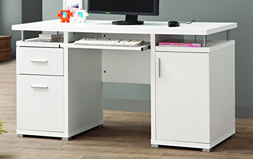 Infuse your home office with style and convenience. This contemporary computer desk features an elegant white finish and metal detailing finished in silver for a sleek, chic appearance. Its ample storage options include a cabinet with an adjustable shelf, a large file cabinet, and a smaller upper drawer. A slide-out keyboard tray completes its versatile appeal. Constructed from steel, MDF, particle board, and engineered veneer, this desk is durable enough for day after day of productivity.