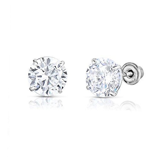 14k White Gold Solitaire Round Cubic Zirconia CZ Stud Earrings in Secure Screw-backs