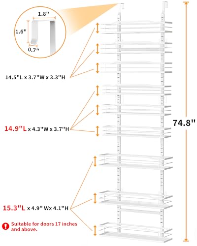 You will get 3 large shelves (15.3″L x 4.9″ x 4.1″H), 3 medium shelves (14.9″L x 4.3″ x 3.7″H), 3 small shelves (14.5″L x 3.7″W x 3.3″H), including all necessary mounting hardware. The overall height after installation is 6.2ft, suitable for most doors. USPTO Patent Number:29884987. PLEASE NOTE: You may receive the wrong package showing “8-Tier”, but the item inside is completely correct 9-tier.