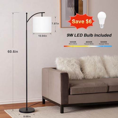 3 Color Temperature Bulb Included: Dimension of this floor lamp is 60” height, diameter and height of lampshade is 10.04” and 7.87”, diameter of base is 8.66”. Includes a 9W LED bulb which has 3 different color adjustable temperature setting: 3000K/5000K/4000K. You can easily change the color temperature to set the overall ambiance of the room.