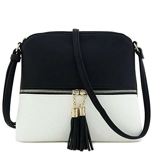 Lightweight Medium Crossbody Bag with Tassel (Black/White)